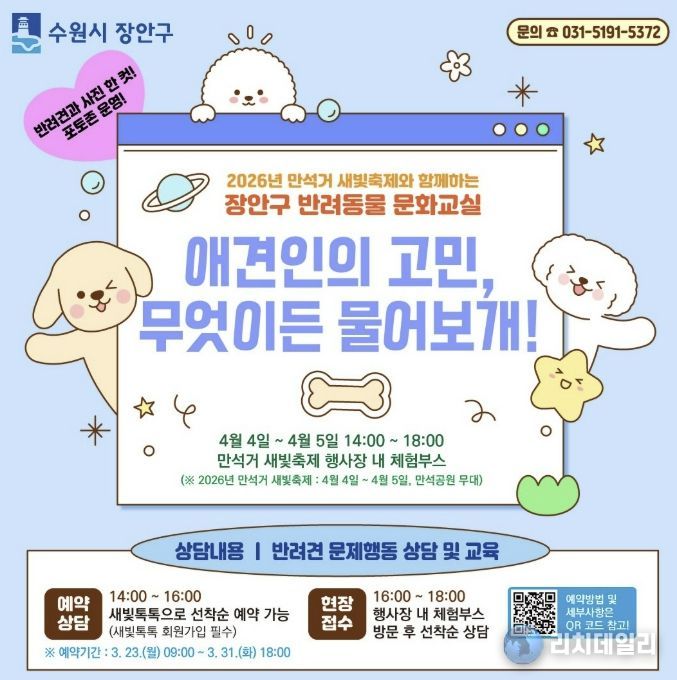 이번 반려동물 문화교실은 2026년 만석거 새빛축제 행사 개최에 맞춰 기획했으며, 반려견의 행동으로 인해 고민하는 시민들을 대상으로 문제행동 상담‧대처요령 및 행동교정 등을 교육한다.