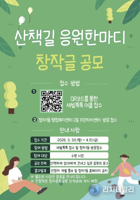리치데일리 김상현 기자 | 수원시 장안구 정자1동은 2026년 주민참여예산 사업인 '아름다운 글귀가 있는 거리 조성' 추진에 따라 정자문화공원 산책로에 설치할 ‘산책길 응원 한마디’ 표지판 창작글을 공모한다고 밝혔다.
