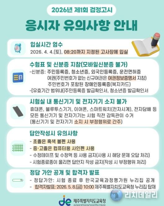 리치데일리 김상현 기자 | 제주특별자치도교육청은 4일 ‘2026년도 제1회 초졸·중졸·고졸 검정고시’를 제주중앙중학교, 서귀중앙여자중학교, 제주교도소, 제주소년원 등 4곳에서 실시한다.