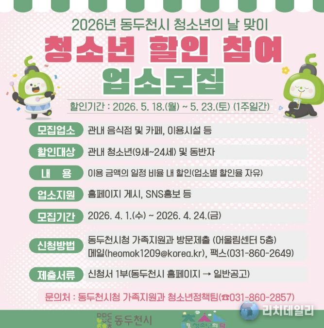 이번 ‘청소년 할인 주간’은 동두천시에 거주하는 청소년(9세~24세)과 동반 보호자를 대상으로 진행하며, 참여 업소에서 자율적으로 정한 할인 혜택(10~30% 할인 또는 증정 서비스 등)을 받을 수 있다.