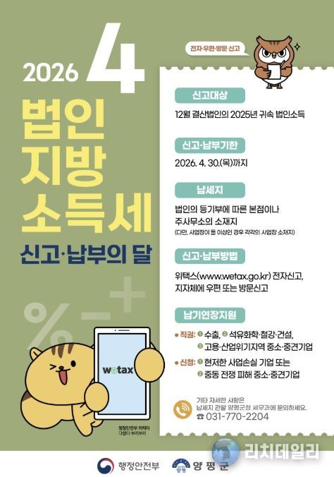 리치데일리 김상현 기자 | 양평군은 ‘4월 법인지방소득세 확정신고·납부의 달’을 맞아 오는 4월 30일까지 법인지방소득세 신고·납부기간을 운영한다고 밝혔다.