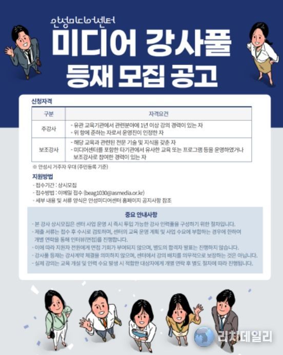 리치데일리 김상현 기자 | 안성시는 4월 1일부터 보다 체계적이고 전문적인 미디어 교육 운영을 위해 ‘미디어 강사풀’ 등재 강사를 상시 모집한다.