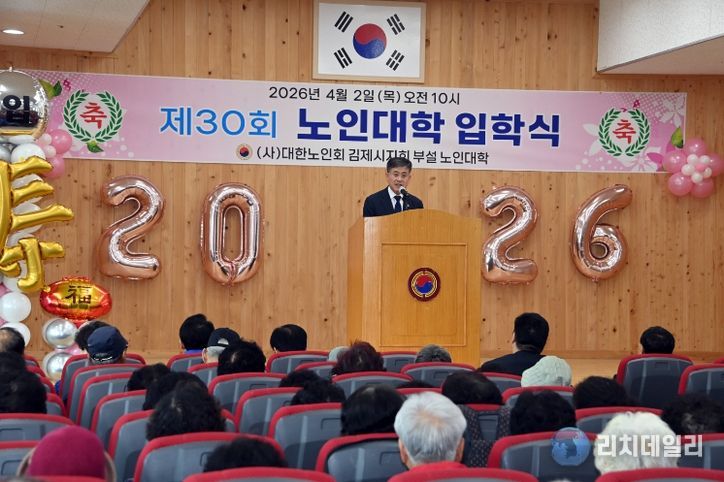 리치데일리 김상현 기자 | 김제시는 대한노인회 김제시지회가 2일 지회 2층 강당에서 노인대학생 및 관계자 등 약 220명이 참석한 가운데 '2026학년도 제30회 노인대학 입학식'을 개최했다고 밝혔다.