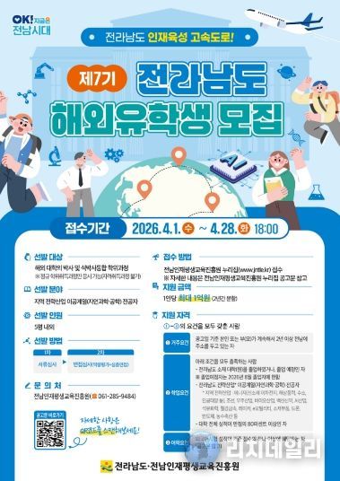 리치데일리 김상현 기자 | 전라남도와 전남인재평생교육진흥원은 글로벌 핵심 인재 육성을 위해 세계 명문대 유학 기회를 제공하는 ‘제7기 전라남도 해외유학생’을 오는 28일까지 모집한다고 밝혔다.