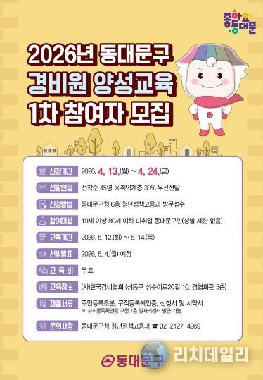 선발된 참여자들은 5월 12일부터 14일까지 3일간의 교육을 통해 경비 업무에 필요한 전문 역량을 갖추게 된다.