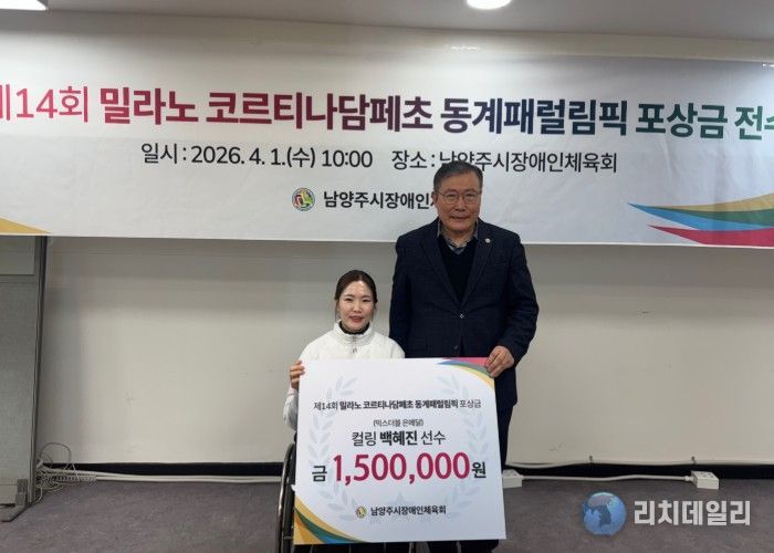 리치데일리 김상현 기자 | 남양주시는 지난 1일 남양주시장애인체육회가 제14회 밀라노-코르티나담페초 동계패럴림픽 휠체어컬링 믹스더블 종목 은메달리스트 백혜진 선수에게 포상금을 전달하고 성과를 격려했다고 2일 밝혔다.