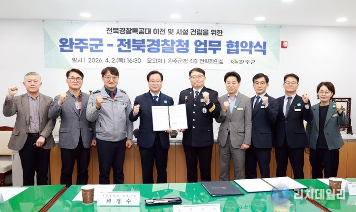 리치데일리 김상현 기자 | 완주군과 전북경찰청은 2일 완주군청 전략회의실에서 경찰특공대 이전 및 청사 신축을 위한 업무협약(MOU)을 체결하고 전북 경찰특공대 이전 사업을 본격적으로 추진하기로 했다.