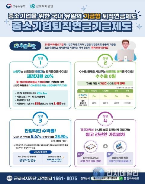 이와 함께 최근'근로자퇴직급여보장법'개정에 따라 오는 7월 1일부터는 가입 대상이 기존 30인 이하 사업장에서 50인 미만 사업장으로 확대되고 2027년부터는 100인 미만 사업장까지 단계적으로 확대될 예정이다.