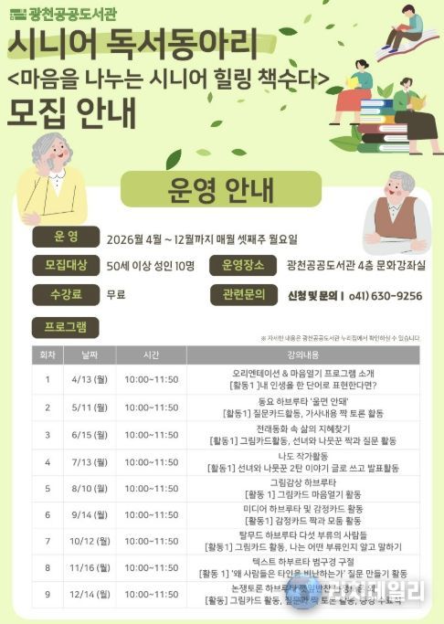 책과 독서에 관심 있는 관내 50세 이상 시니어라면 누구나 신청할 수 있으며 광천공공도서관누리집 프로그램 신청 또는 전화 접수로 신청하면 된다.