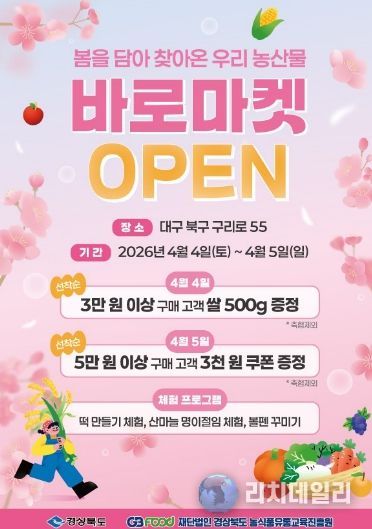 리치데일리 김상현 기자 | 경상북도는 오는 4월 4일부터 12월 6일까지 매주 토․일요일 오전 9시부터 오후 5시까지 대구시 북구 구리로에 위치한 경상북도 농업자원관리원에서 바로마켓 경상북도점을 운영한다고 밝혔다.