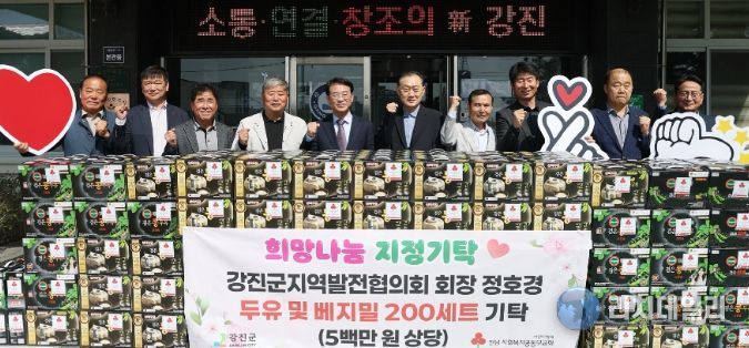 리치데일리 김상현 기자 | 강진군지역발전협의회 정호경 회장이 지난 2일 강진군청을 방문해 관내 취약계층을 위한 두유 및 베지밀 200세트(500만 원 상당)를 지정기탁하며 지역사회에 훈훈한 감동을 전하고 있다.