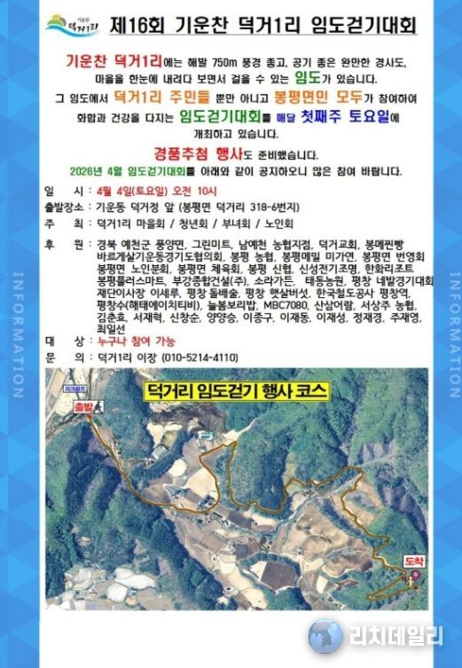 리치데일리 김상현 기자 | 평창군 봉평면 덕거1리(이장 안현태)에서 지역 주민과 방문객이 함께하는'제16회 기운찬 덕거리 임도걷기대회'가 오는 4월 4일 개최된다.