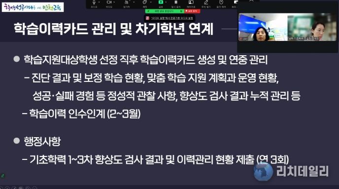주요 내용은 ▲기초학력 보장 계획 및 예산 활용 점검 ▲학습 지원대상학생 지원협의회 운영 ▲지원 프로그램 미참여 학생 지원 방안 ▲기초학력 보장 프로그램 운영 ▲성장기록 프로그램 활용 방법 등이다.