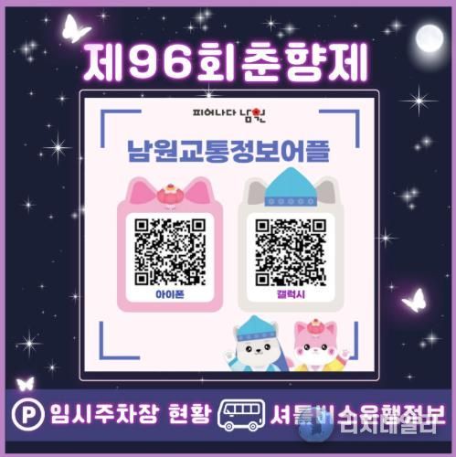 축제 관련 현수막과 주차장·셔틀버스 안내 홍보물 등에 QR코드를 삽입해, 별도의 검색 과정 없이 스마트폰 스캔만으로 남원시 교통정보 앱을 즉시 설치할 수 있도록 지원할 계획이다.