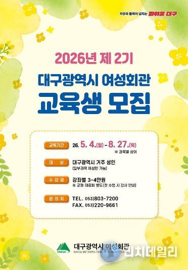 리치데일리 김상현 기자 | 대구광역시 여성회관은 시민들의 자기계발을 돕고 평생학습 기회를 확대하기 위해 4월 6일부터 ‘2026년 제2기 교육생’을 모집한다.