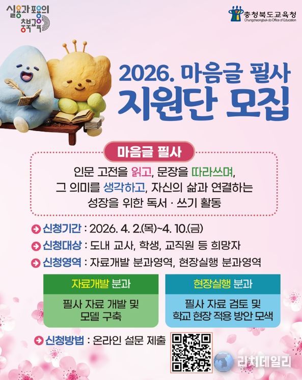 리치데일리 김상현 기자 | 충청북도교육청은 2일부터 10일까지 '2026. 마음글 필사 지원단'을 모집한다고 밝혔다.