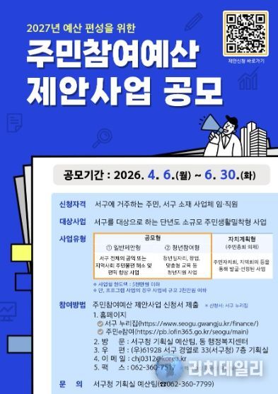 리치데일리 김상현 기자 | 광주광역시 서구가 실질적인 주민주권 강화를 위해 ‘주민참여예산 제안사업 공모’를 6월 30일까지 진행한다. 이번 공모는 내년도 예산에 반영할 주민 제안사업을 모집하는 것으로 이달 6일부터 접수를 시작한다.