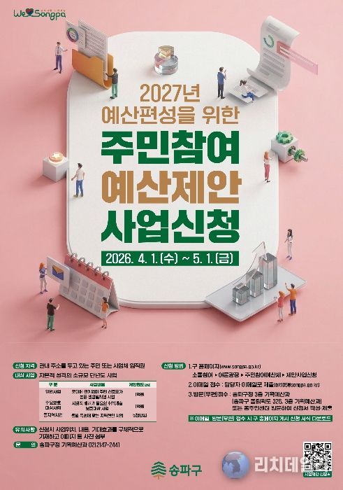 송파구는 2027년도 주민참여예산 제안사업을 5월 1일까지 공모한다고 6일 밝혔다. 올해는 예산 규모를 전년보다 5억 원 늘린 총 15억 원으로 확대했다.