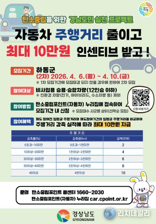 리치데일리 김상현 기자 | 하동군이 4월 6일부터 10일까지 탄소중립포인트제(자동차 분야) 2차 모집을 진행한다.