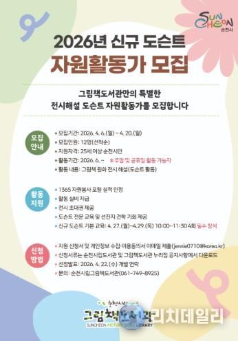 리치데일리 김상현 기자 | 순천시는 순천시립그림책도서관에서 그림책과 시민을 잇는 문화 해설 활동을 함께할 신규 도슨트 자원활동가를 모집한다고 밝혔다.