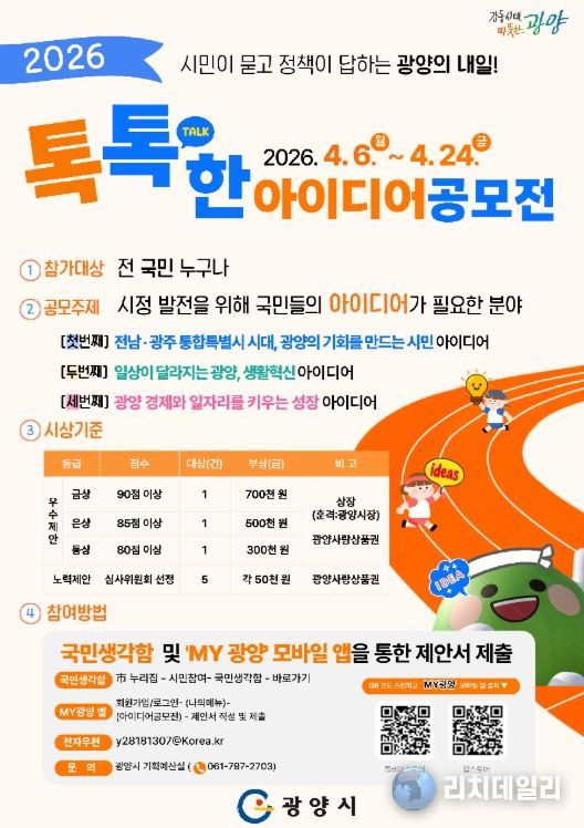 리치데일리 김상현 기자 | 광양시는 시민의 창의적인 의견을 시정에 반영하고 소통 중심 행정을 강화하기 위해 ‘2026년 톡톡(talk)한 아이디어 공모전’을 실시한다고 밝혔다.