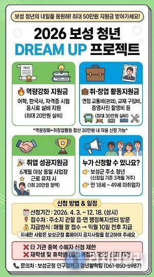 리치데일리 김상현 기자 | 보성군은 고향사랑기부제로 조성된 기금 6,000만 원을 활용해 지역 청년의 취업·창업을 지원하는 ‘2026년 보성 청년 DREAM UP 프로젝트’를 본격 추진한다고 밝혔다.