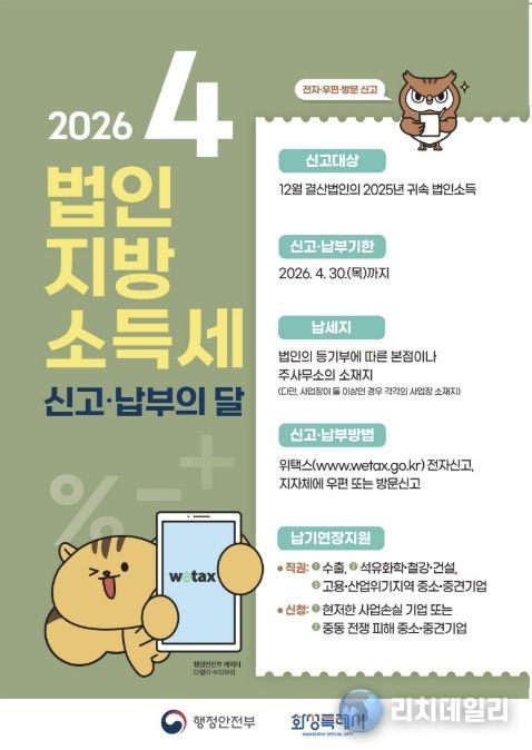 리치데일리 김상현 기자 | 화성특례시가 2025년 귀속 ‘법인지방소득세 집중 신고·납부 기간’을 오는 4월 30일까지 운영한다고 밝혔다.