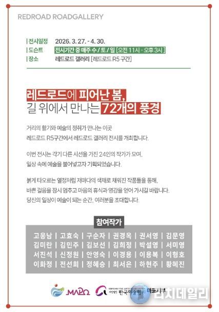 이번 전시는 ‘레드로드에 피어난 봄, 길 위에서 만나는 72개의 풍경’을 주제로 총 24명의 작가가 참여해 회화와 일러스트 등 다양한 작품 72점을 선보인다.