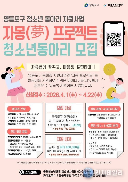 리치데일리 김상현 기자 | 영등포구가 청소년들의 자율적 활동과 창의적인 도전을 지원하는 ‘자몽(夢) 프로젝트’에 참여할 동아리를 오는 22일까지 모집한다고 밝혔다.
