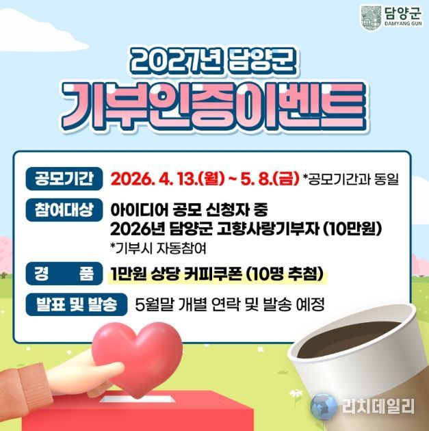 리치데일리 김상현 기자 | 담양군은 고향사랑기부제에 관심을 높이고 지역에 변화를 이끌 기금사업을 발굴하기 위해 오는 5월 8일까지 ‘담양을 위한 따뜻한 제안, 고향사랑 기금사업 아이디어 공모’를 추진한다.