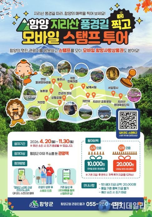 리치데일리 김상현 기자 | 함양군은 함양의 대표 관광자원을 보다 쉽고 재미있게 즐길 수 있도록, 관광객 참여형 이벤트인 ‘함양 지리산 풍경길 찍고 모바일 스탬프 투어’를 운영한다고 밝혔다.