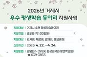 리치데일리 김상현 기자 | 거제시가 지역사회 학습공동체 형성과 배움문화를 조성하기 위해 '2026년 거제시 우수 평생학습 동아리 지원사업'을 실시한다. 지원대상은 관내 소재 평생학습동아리이며, 선정된 학습동아리 5개팀에 강사비, 교재·재료비, 홍보비 등 동아리 활동에 필요한 직접 운영 경비(100만원)를 지원한다. 신청방법은 공모신청서를 작성하여 거제시 평생교육과로 방문접수하면 되고, 접수기간은 4월 22일부터 4월 24일까지이다. 기타 자세한 사항은 거제시 평생학습관 홈페이지 공지사항 또는 거제시 평생교육과 평생학습팀으로 문의하면 된다.