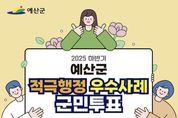 리치데일리 김상현 기자 | 예산군은 2025년 하반기 적극행정 우수공무원 선발을 위해 4월 1일부터 7일까지 7일간 온라인 군민투표를 실시한다고 밝혔다. 군은 적극적인 업무 추진으로 공공의 이익 증진에 기여하고 공직사회에 적극행정 문화를 확산하기 위해 매년 상하반기 적극행정 우수공무원 선발을 추진하고 있다. 군민투표는 1차 내부 실무평가단 심사를 통과한 적극행정 사례 18건 중 2건에 투표하는 방식으로 진행되며, 정보무늬(QR코드) 접속 또는 군 누리집 ‘군민참여-설문조사’ 코너에서 본인인증 후 참여할 수 있다. 군은 실무심사와 군민투표, 적극행정위원회 심사 점수를 합산해 4월 중 적극행정 우수공무원을 선발하고 인사상 우대 조치와 함께 포상금을 지급할 계획이다. 군 관계자는 “현장의 다양한 목소리를 정책에 반영하고 적극행정을 더욱 활성화하기 위해 우수공무원 선발에 많은 관심과 참여를 부탁드린다”고 당부했다.