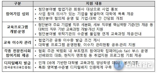 분야별 협업기관은 △참여기업 섭외, △교육프로그램 개발 및 운영, △교육 이수자 관리, △각종 전문 전시회 참여기회 제공 등 사업 운영의 전 단계에서 대학-기업의 교류를 활성화하고, 학생들을 지원하는 역할을 한다. 또한, 대학별 교육과정을 분석하여, 특화 영역별·수준별 디지털 배지 발급을 지원하는 등 인증 체계를 구축하기도 한다.