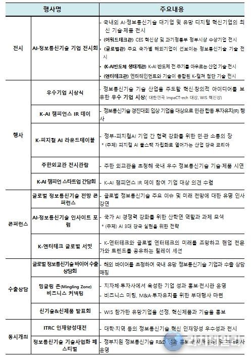 또한, 올해 처음으로 다양한 전문 프로그램도 운영된다. ‘인공지능·정보통신기술 통찰력 토론회(인사이트 포럼)’에서는 인공지능 3대 강국 도약을 위한 정책·기술 전략을 산·학·연 전문가들과 함께 논의하고, ‘한국형 물리적 인공지능 원탁회의(K-피지컬 AI 라운드테이블)’에서는 정부와 기업이 참여하여 산업 현장 중심의 물리적 인공지능(피지컬 AI) 기술 발전 방향과 협력 방안을 모색한다. 아울러, ‘한국형 융합 콘텐츠 기술 세계 정상회의(K-엔터테크 글로벌 서밋)’에서는 K-콘텐츠와 인공지능 기술의 융합 사례를 기반으로 세계 시장 진출 전략과 사업 모델을 공유할 예정이다.