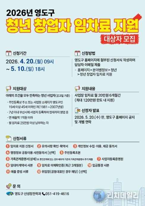 리치데일리 김상현 기자 | 부산 영도구는 청년 창업가들의 경제적 부담을 덜어주고 지역 내 안정적인 사업 기반 마련을 돕기 위해 지난해에 이어 '2026년 청년 창업자 임차료 지원사업' 참여자를 모집한다고 밝혔다.