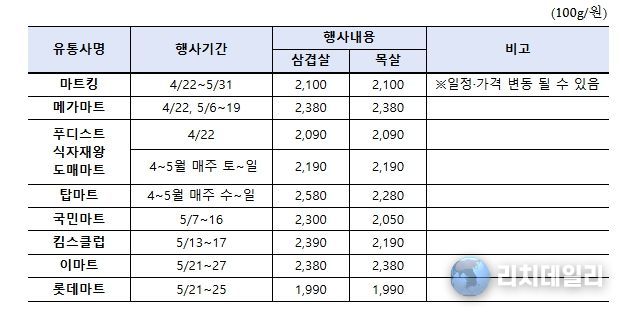 오프라인 할인행사는 전국 8개 마트에서 4월 22일부터 5월 31일까지 한돈 삼겹살, 목살을 최대 30% 이상 할인된 가격에 판매한다.