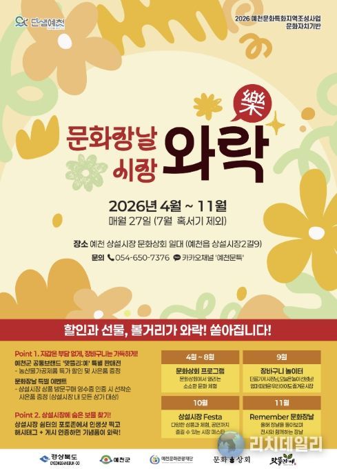 리치데일리 김상현 기자 | (재)예천문화관광재단은 오는 4월 27일부터 11월까지 매달 27일, 예천 장날에 예천읍 상설시장 일대에서 ‘문화장날 시장와~락(樂)’을 개최한다.