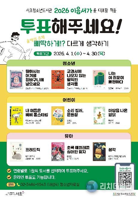리치데일리 김상현 기자 | 서울 서초구 서초청소년도서관은 주민과 한 권의 책을 선정해 함께 읽고 생각과 경험을 나누는 ‘2026 서청도 한 책 : 이음서가’ 운영을 위해 이달 말까지 올해의 대표 도서 선정 투표를 진행한다.