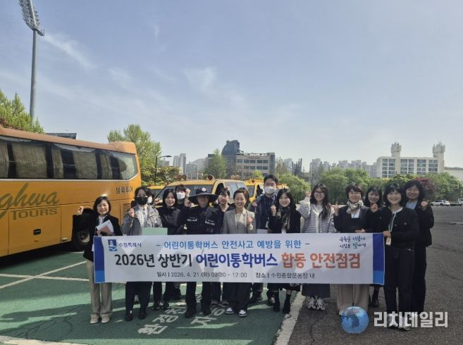 리치데일리 김상현 기자 | 수원특례시는 21일 수원종합운동장 주차구역에서 수원 장안·권선·팔달·영통경찰서, 한국교통안전공단과 함께 ‘2026년 상반기 어린이통학버스 합동 안전점검’을 했다.
