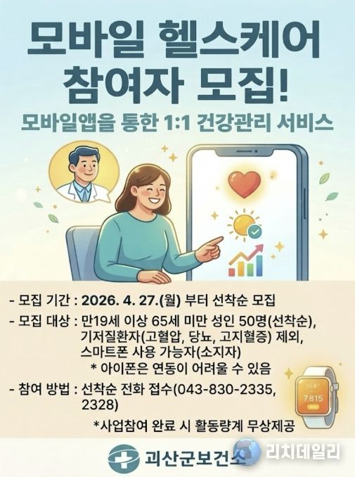 리치데일리 김상현 기자 | 괴산군보건소는 ICT 기술을 활용한 비대면 건강관리 서비스인 ‘2026년 보건소 모바일 헬스케어 사업’ 참여자 50명을 오는 27일부터 선착순 모집한다.