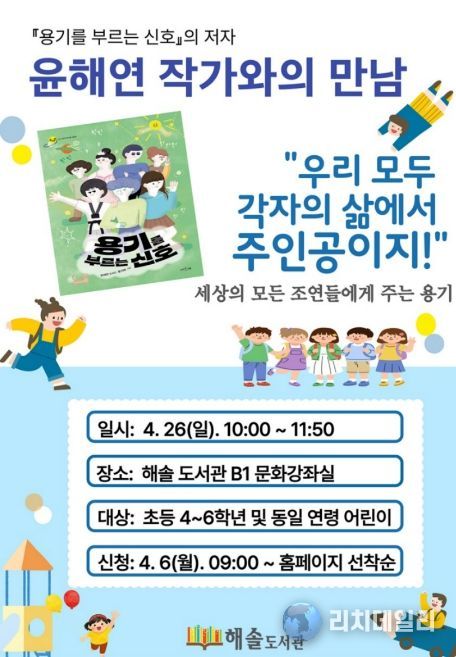 이번 행사는 해솔도서관 어린이 자료실 3~4월 전시 도서 연계 프로그램의 일환으로, 도서관 전시 도서에 대한 관심을 배가시키고, 어린이들이 직접 전시 도서의 주제(‘네 삶의 주인공이 되어줘!’)와 관련된 활동에 참여할 수 있도록 마련됐다. 특히, 윤해연 작가와 또래 친구들과 함께 그의 도서 '용기를 부르는 신호'(서유재, 2025)에 등장하는 인물들이 내는 서로 다른 용기를 들여다보며 주인공이란 특별한 능력을 지닌 사람이 아닌, 용기를 내고 한 걸음씩 나아가는 사람이라는 것을 깨닫게 되는 시간이 될 것으로 기대된다.