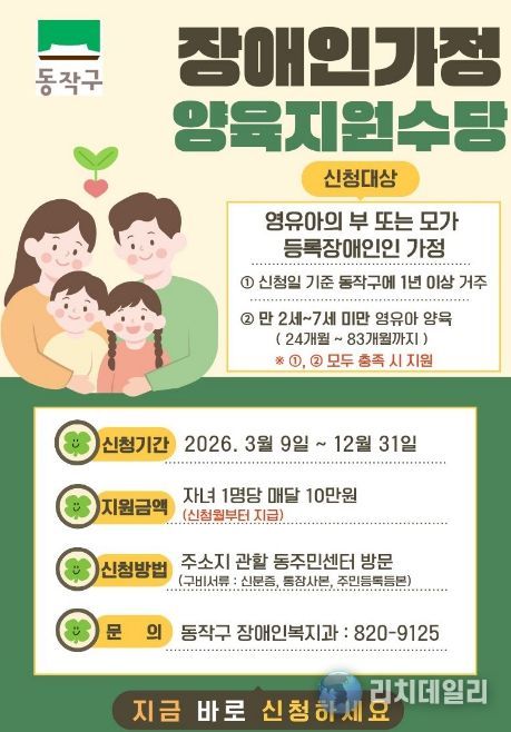 리치데일리 김상현 기자 | 동작구는 관내 장애인 가정의 경제적 부담을 완화하고, 안정적인 양육 환경을 조성하기 위해 올해부터 ‘장애인가정 양육지원수당’을 새롭게 지급한다고 밝혔다.