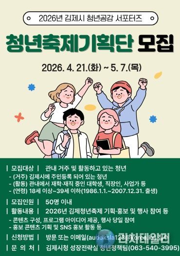 리치데일리 김상현 기자 | 김제시는 청년이 주도하는 축제 기획을 통해 지역 청년 참여를 확대하고 활력을 불어넣고자 '청년축제기획단(김제시 청년공감 서포터즈)'을 모집한다고 밝혔다.