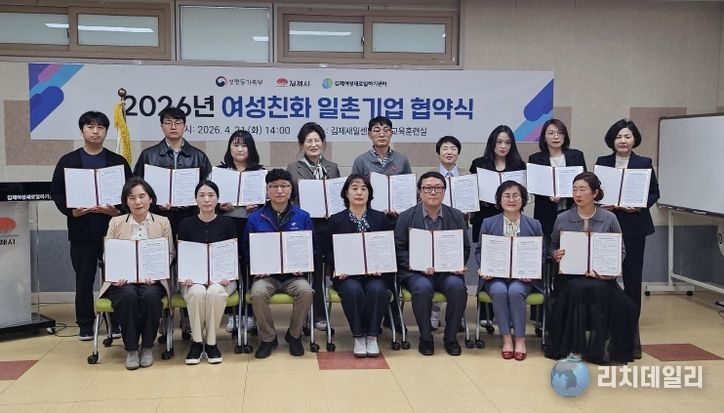 리치데일리 김상현 기자 | 김제시여성새로일하기센터는 지난 21일 새일센터 직업훈련실에서여성 취업자의 고용 유지 지원 등을 위한 지역 업체와의 협력망 구축을 위해'2026년 여성친화 일촌기업 협약식'을 개최했다고 밝혔다.