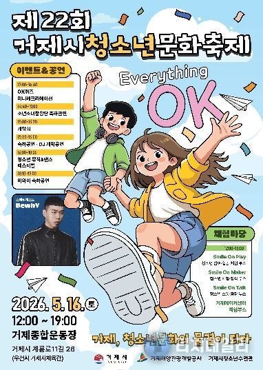리치데일리 김상현 기자 | 거제시는 오는 2026년 5월 16일 12:00~19:00, 거제종합운동장(우천 시 거제시체육관)에서 제22회 거제시청소년문화축제 “Everything OK”를 개최한다.