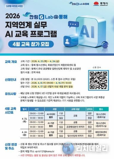 리치데일리 김상현 기자 | 동해시와 한림대학교(총장 최양희)는 동해시 청소년센터와 북평산업단지 복합문화센터에서 공공행정 및 지역 산업체 종사자를 대상으로 직무 특성에 맞춘'한림 G-Lab@동해 지역 연계 실무형 AI 교육 프로그램'을 운영한다고 밝혔다.