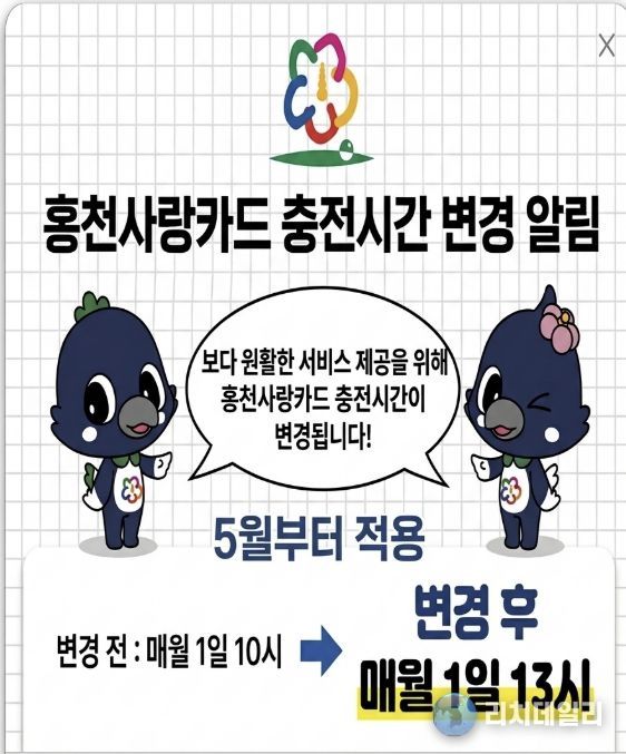 홍천군 관계자는 “충전 시간 조정은 이용자 불편을 줄이고 시스템 안정성을 높이려는 조치”라며, “앞으로도 홍천 사랑 카드를 더욱 편리하게 이용할 수 있도록 운영 관리에 힘쓰겠다”라고 말했다.