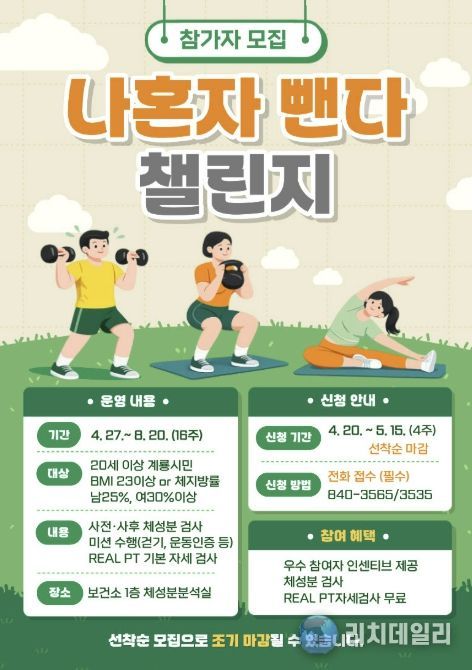 리치데일리 김상현 기자 | 충남 계룡시는 시민들의 건강한 체중 감량과 올바른 운동 습관 형성을 위해 오는 5월 15일까지 ‘나혼자 뺀다’ 챌린지 참여자 300명을 선착순으로 모집한다고 밝혔다.