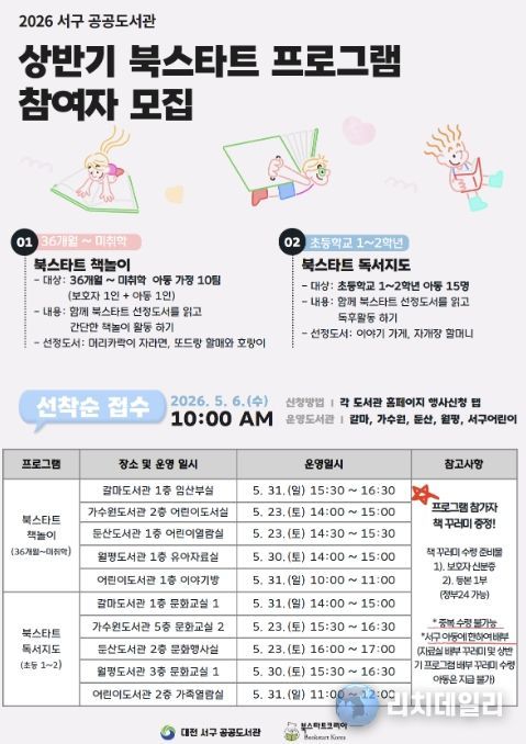 리치데일리 김상현 기자 | 대전 서구 5개 공공도서관(갈마·가수원·둔산·월평·어린이)은 영유아와 어린이들의 건강한 독서 습관 형성을 돕기 위해 2026년 상반기 ‘북스타트 프로그램’을 운영한다.